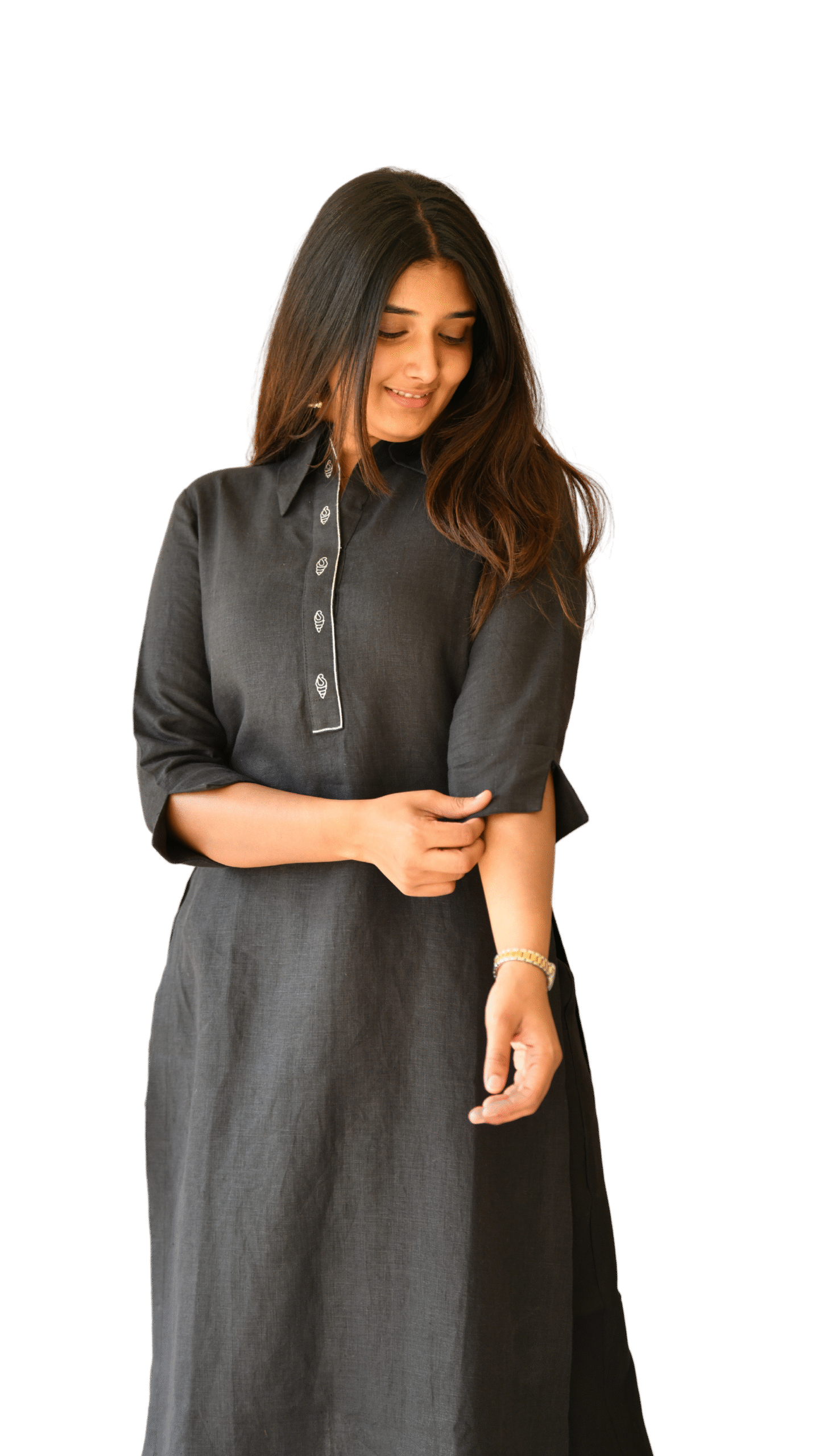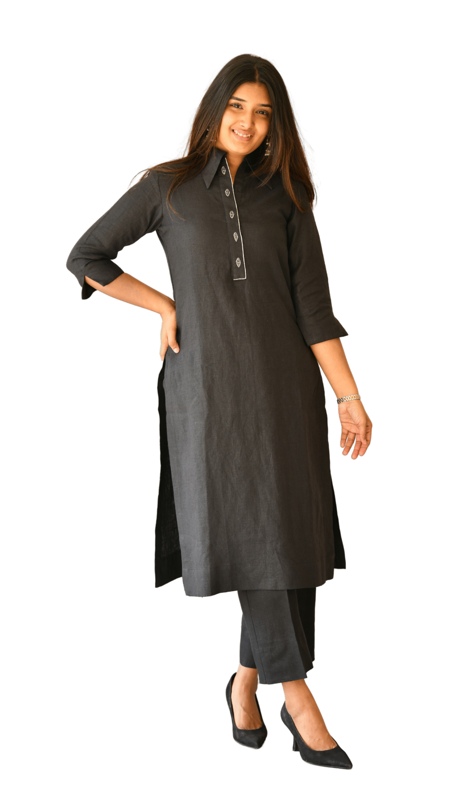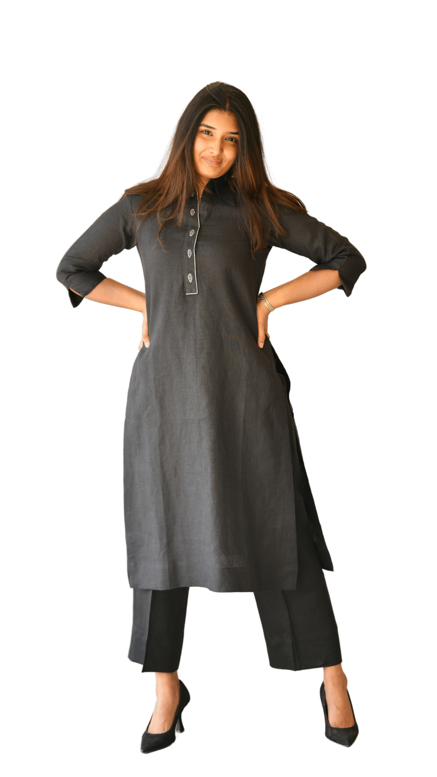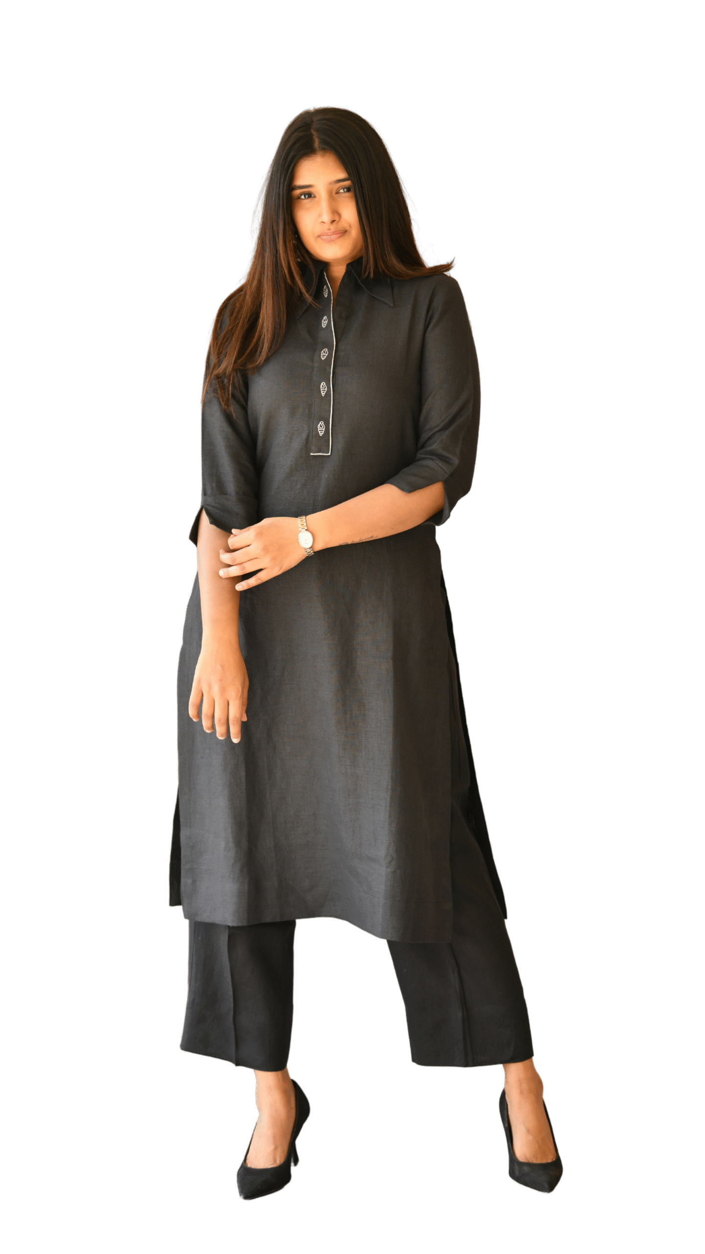 A masterpiece of linen craftsmanship, this kurta boasts exquisite embroidery, paired harmoniously with linen palazzos designed for a perfect fit with their elasticated waist.